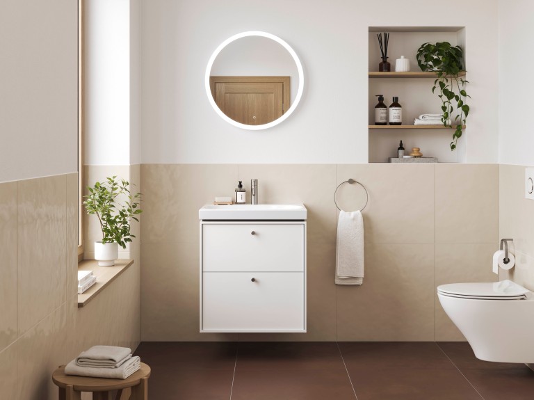 Kuvassa näkyvät tuotteet: IDO Sense Art -kylpyhuonekalusteet, Geberit Option pyöreä peili, IDO Glow Style seinä-wc.
