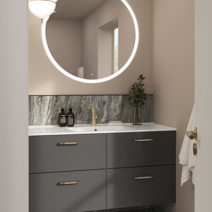 Kylpyhuonekalusteiden tulisi olla sekä esteettisiä että käytännöllisiä. Moderneilla ja toimivilla kaapeilla voit luoda toimivan kokonaisuuden. IDO Elegantin kanssa ei voi mennä pieleen. Elegant on suunniteltu modernilla silmällä. Puhtaiden linjojensa lisäksi se tarjoaa tilaa säästäviä, osittain jopa peilin taakse kätkettyjä säilytysratkaisuja. Voit valita kaapit yksinkertaisella, kahvattomalla push open -mekanismilla. Jos pidät yksilöllisemmästä tyylistä, voit valita kaappeihisi eri tavoin muotoiluja kahvoja.